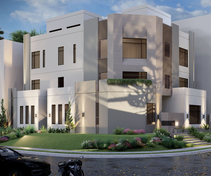 THE CORNER VILLA is a 3-story villa situated in Al-Mutlaa. The design emphasizes a connection between the floors achieved through a double volume. The spacious garden alongside offers a pleasant view of both the interior and exterior spaces.