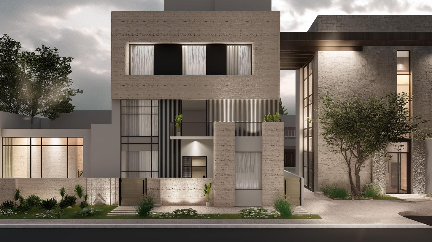 A modern villa featuring open spaces seamlessly blending indoor and outdoor living. The design incorporates a small garden that enhances the interior elements, creating a natural and tranquil ambiance. A touch of wood on the facade adds warmth and elegance, complementing the contemporary aesthetic. Large windows and open layouts ensure abundant natural light and a spacious feel.